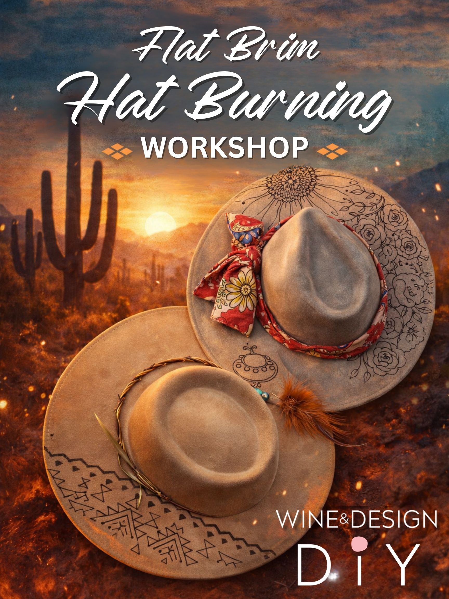 Join us in creating your very own stencil burned hat. In this class you will use stencils of your choice to help guide you as you burn into your vegan suede, wide flat brim hat. You will learn which tools to use to transfer from a stencil or if you choose, to freehand design. Be prepared to listen to music, laugh and let go of stress. Bring a guest or come alone, we promise you will have a great experience. No artistic talent needed.. We have snacks, chips, sodas and waters for sale. We also supply cork screws and ice. We are currently a bring your own beer or wine location. (ABC Permit pending for future) Please arrive 15 minutes early. Classes last approximately 2 hours. This is an adult workshop party. Anyone under the age of 18 must be accompanied by an adult. Each person present in studio must have a paid seat. Meeting someone? Please list names of attendees in special instructions box to be seated together. ** Cancellation policy as follows : All sales are final. Refunds will not be given in the event that a customer cancels their reservation. To receive a credit to be redeemed within 60 days towards another class you must email [email protected] before an event at least 24 hours in advance. If there is a threat of inclement weather or if the event has low attendance, it is subject to cancellation. If this is the case, you will be given a credit to be redeemed within 60 days for another class of equal value. Look forward to seeing you! Cheers!
