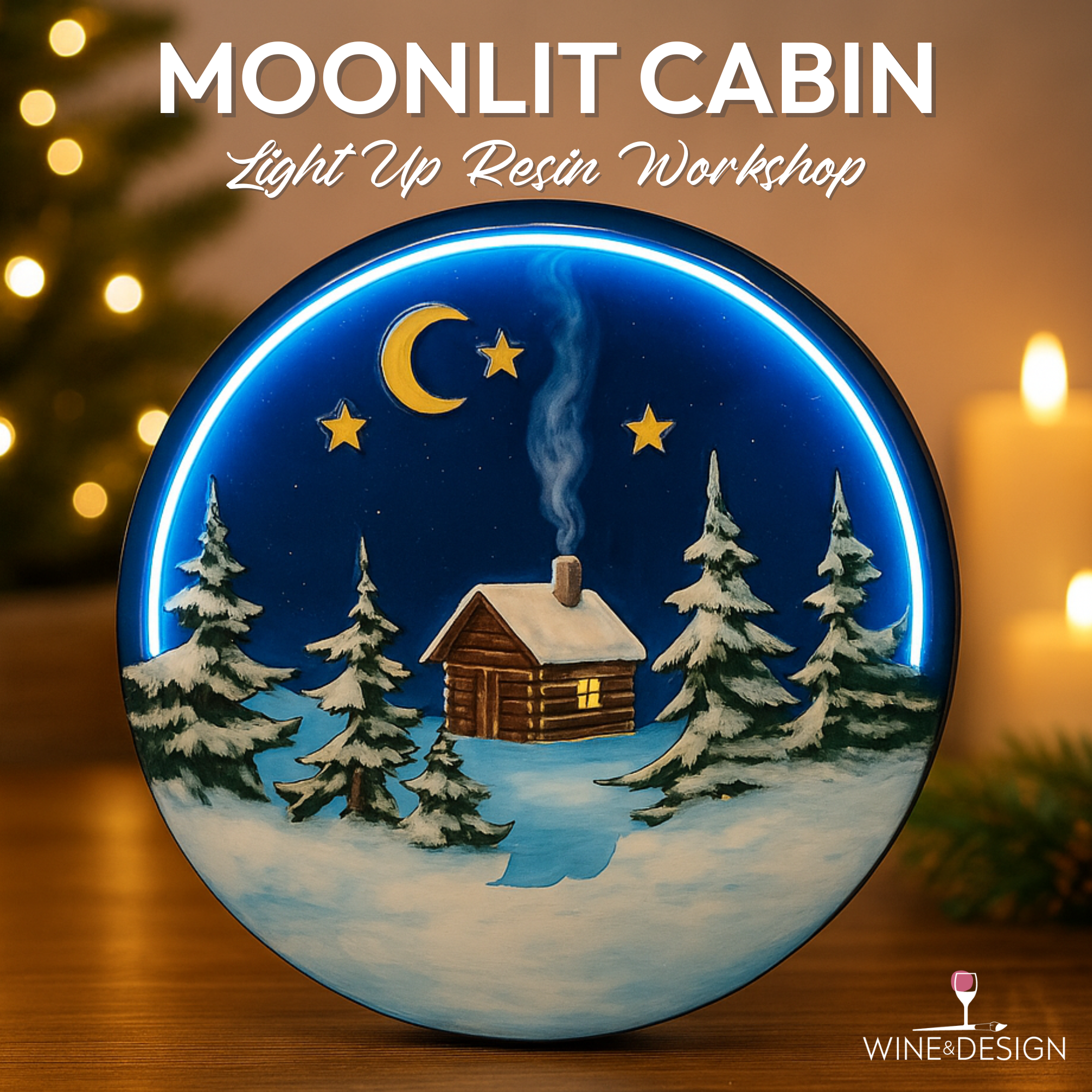 Our #1 winter release — exclusive to Wine & Design Snohomish! Cozy, glowing, and absolutely breathtaking in person — this is the project everyone will be talking about this season! Create your own 3D illuminated Moonlit Cabin scene featuring a rustic log cabin surrounded by snowy evergreens beneath a starlit winter sky. You’ll layer paint, resin and shimmer to build dimension and depth, with built-in lighting that makes your artwork come alive. Once it’s glowing, you’ll understand why this is our most anticipated workshop of the year. Boutique experience. Limited seats. No experience needed. Everything is provided — just bring your favorite people and get ready to create something magical. **Optional Food Add-Ons!!** Cupcakes and treats are offered through our partnership with Simply Sweet Cupcakes! Each order is made fresh for your event! ADD TO CART WHEN PURCHASING YOUR EVENT TICKETS SO WE KNOW WHEN TO PREPARE YOUR ORDER. Click here to add snacks to cart. THANK YOU for your continued loyalty and support! We're so grateful for our amazing community - thank you for choosing to create with us and for being part of the Wine & Design family! Sign up. Show up. Sip up. PAINT! No artistic experience? No problem! This is a fun, instructor-led event where we guide you step-by-step. Just sign up and show up - we'll take care of the rest! We offer a great selection of wine, beer, cider; and fun non-alcoholic beverages too! As a licensed venue, outside alcohol is not permitted. Light snacks are available for purchase, or you're welcome to bring your own! Please note: Drinks and snacks are not included in the ticket price unless otherwise stated. Arrive Early. To ensure a smooth experience, we recommend arriving 15 minutes early to grab your drink and get settled in. Let the stress melt away - it's time to unwind and create! Celebrating something special? We love helping you celebrate! Whether it's a birthday bash or a cozy date night, we're here to make it memorable! Start time matters. Painting begins promptly at the listed start time. To maintain the flow of the class, we are unable to offer detailed catch-up instructions to guests arriving more than 10 minutes late. Please plan to arrive on time so you don't miss out on the full experience! Reservations and payment must be made in advance to secure your seat. LOCATION: You'll find us two doors down from the Snohomish Station Starbucks (in the Fred Meyer/Home Depot/Kohls Shopping Center). Group Seating Requests: Booking separately but want to sit together? Let us know how many are in your party and include guest names in the "Special Instructions" section at checkout - we'll make sure you're seated together! Canvas Options: All canvases are lightly pre-sketched. Prefer to start with a blank one? Just leave a note in the Special Instructions section when you checkout. Age Policy: Ages 13+ welcome. Guests under 16 must be accompanied by an adult. You must be 21+ to consume alcohol. Need Help? For the fastest response, email us anytime at [email protected] with questions. *CANCELLATION POLICY: ALL SALES FINAL - NO REFUNDS. (Think of it like buying tickets to a concert or other event). We are happy to credit your class up to 2 days before your event date. Same day credits requested will be given minus a $20 processing fee. Because of the advance preparation involved, limited capacity and high demand, we are unable offer full class credit or refunds for missed/no show classes.
