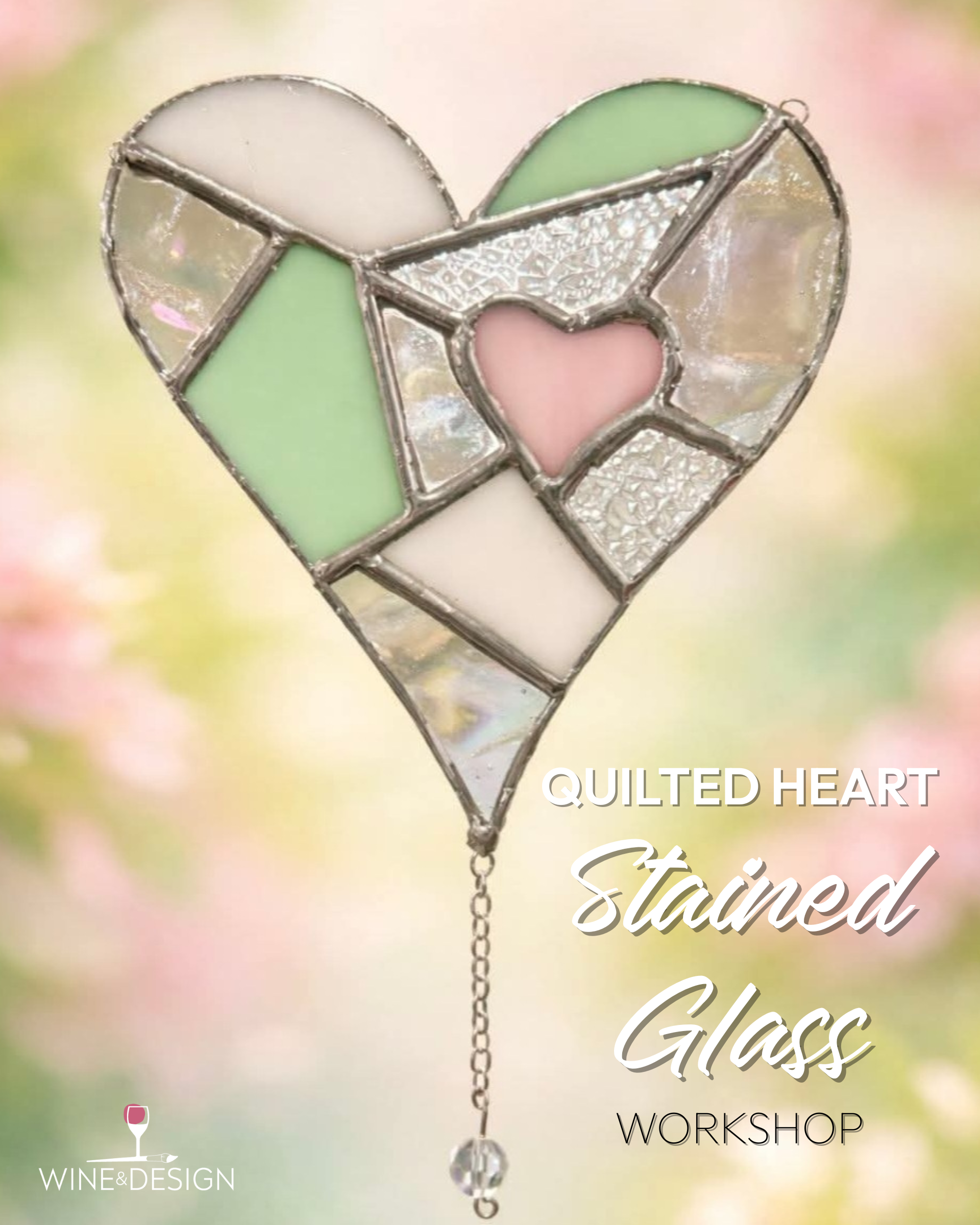 Fall in love with stained glass in this beautiful, beginner-friendly workshop featuring our stunning Quilted Heart design. Inspired by the warmth and charm of heirloom quilts, this piece layers soft curves, geometric lines, and romantic color tones into a timeless heart you’ll be proud to display. In this guided, hands-on class, you’ll assemble a pre-cut stained glass heart using the copper foil method. No glass cutting required — all pieces are professionally cut and prepared in advance so you can relax, create, and enjoy the experience. Our instructor will walk you through foiling, soldering, and finishing techniques step by step. Perfect for a creative night out, Valentine’s season, or anyone looking to try stained glass for the first time. Enjoy wine, cocktails, and good company while you create something truly special. Skill level: beginner friendly Spaces are limited — this is one of our most requested new designs! **Optional Food Add-Ons!!** Cupcakes and treats are offered through our partnership with Simply Sweet Cupcakes! Each order is made fresh for your event! ADD TO CART WHEN PURCHASING YOUR EVENT TICKETS SO WE KNOW WHEN TO PREPARE YOUR ORDER. Click here to add snacks to cart. THANK YOU for your continued loyalty and support! We're so grateful for our amazing community - thank you for choosing to create with us and for being part of the Wine & Design family! Sign up. Show up. Sip up. PAINT! No artistic experience? No problem! This is a fun, instructor-led event where we guide you step-by-step. Just sign up and show up - we'll take care of the rest! We offer a great selection of wine, beer, cider; and fun non-alcoholic beverages too! As a licensed venue, outside alcohol is not permitted. Light snacks are available for purchase, or you're welcome to bring your own! Please note: Drinks and snacks are not included in the ticket price unless otherwise stated. Arrive Early. To ensure a smooth experience, we recommend arriving 15 minutes early to grab your drink and get settled in. Let the stress melt away - it's time to unwind and create! Celebrating something special? We love helping you celebrate! Whether it's a birthday bash or a cozy date night, we're here to make it memorable! Start time matters. Painting begins promptly at the listed start time. To maintain the flow of the class, we are unable to offer detailed catch-up instructions to guests arriving more than 10 minutes late. Please plan to arrive on time so you don't miss out on the full experience! Reservations and payment must be made in advance to secure your seat. LOCATION: You'll find us two doors down from the Snohomish Station Starbucks (in the Fred Meyer/Home Depot/Kohls Shopping Center). Group Seating Requests: Booking separately but want to sit together? Let us know how many are in your party and include guest names in the "Special Instructions" section at checkout - we'll make sure you're seated together! Age Policy: Ages 18+ welcome. You must be 21+ to consume alcohol. Need Help? For the fastest response, email us anytime at [email protected] with questions. *CANCELLATION POLICY: ALL SALES FINAL - NO REFUNDS. (Think of it like buying tickets to a concert or other event). We are happy to credit your class up to 2 days before your event date. Same day credits requested will be given minus a $20 processing fee. Because of the advance preparation involved, limited capacity and high demand, we are unable offer full class credit or refunds for missed/no show classes. Weather-related credits apply to the amount originally paid. Future workshop pricing is based on the date the class is held.
